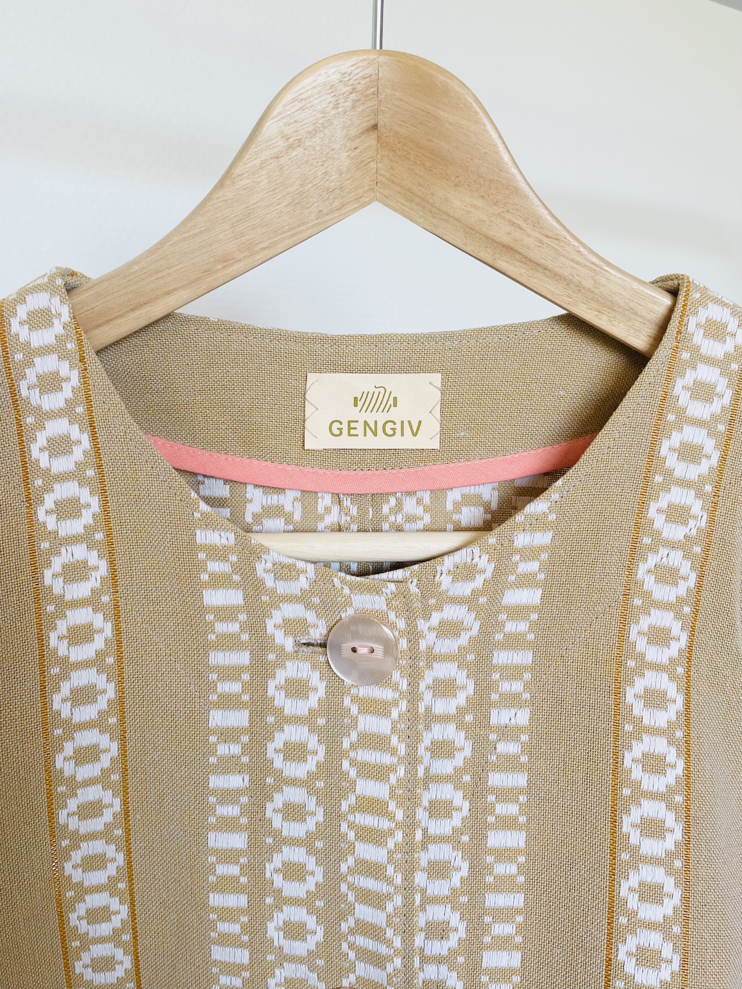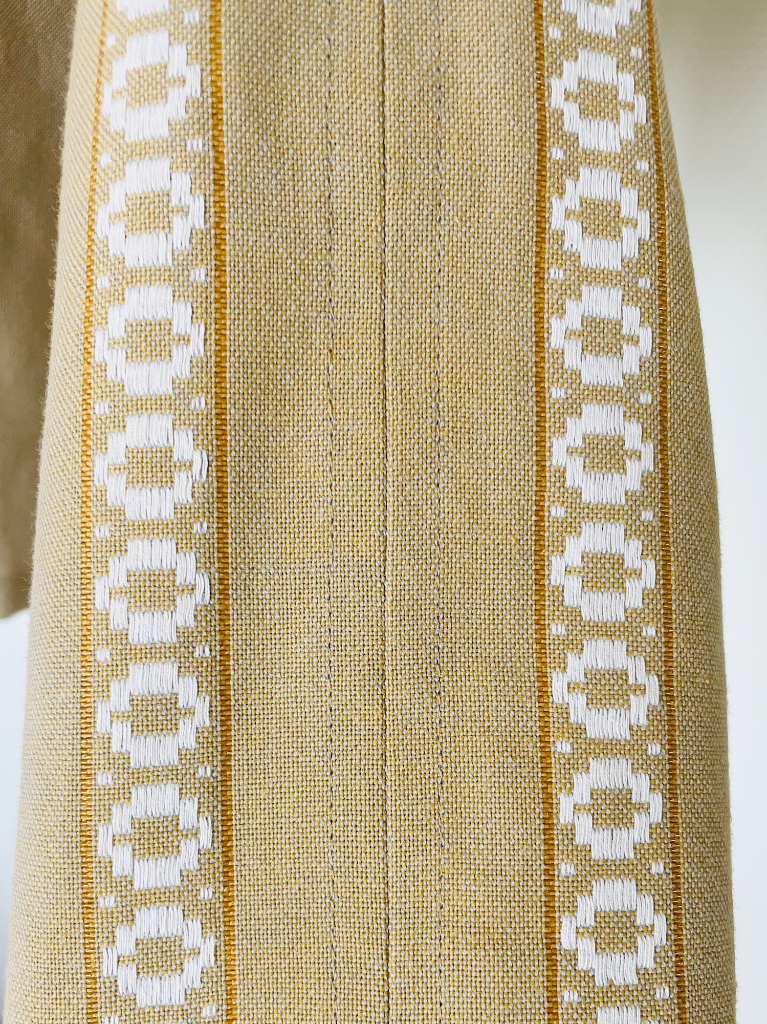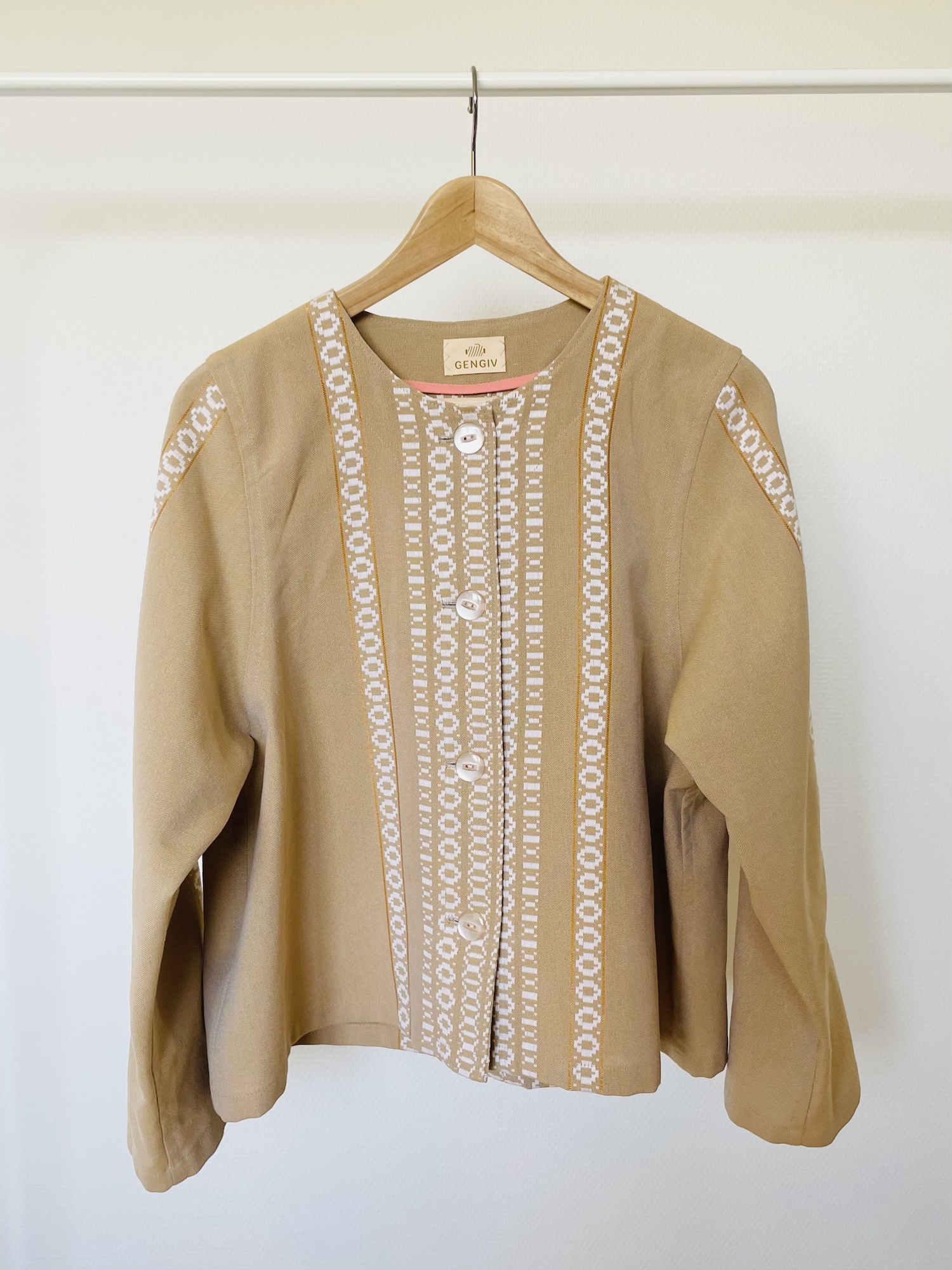 Lys brun skjorte med hvide mønsterstriber og gulddetaljer. Jeg har syet hvert ærme sammen, af to stykker stof, så de flotte striber løber parvis ned af armene