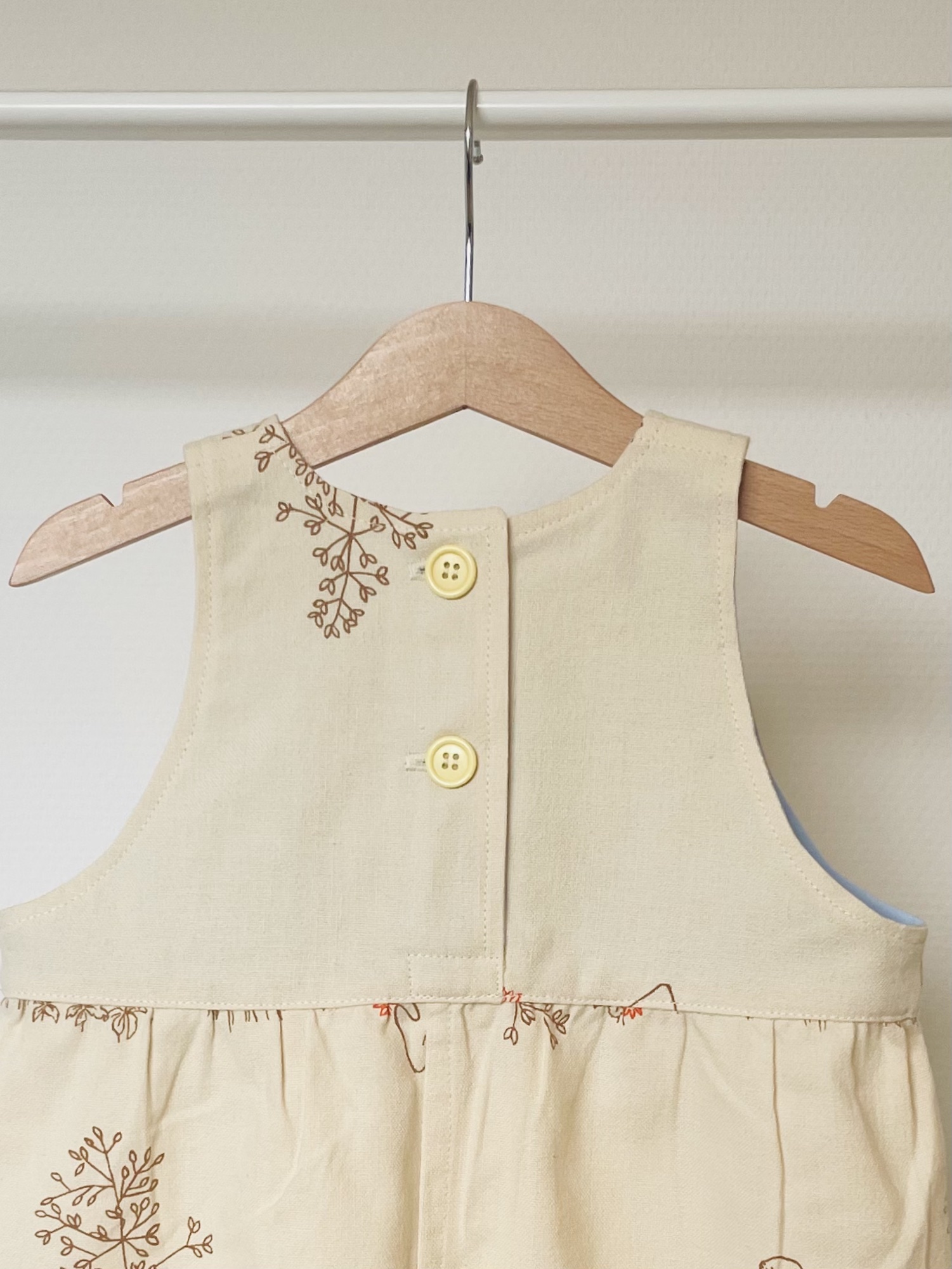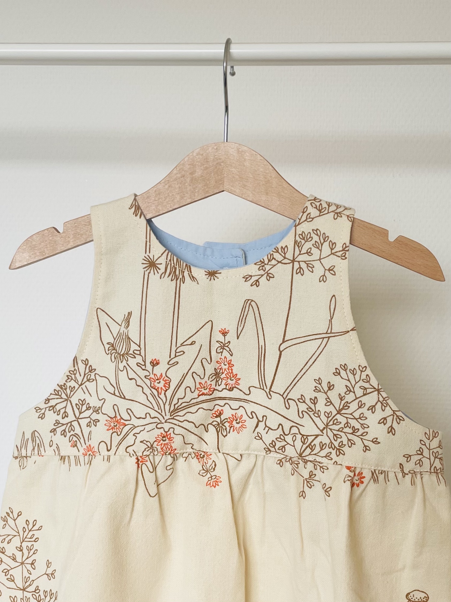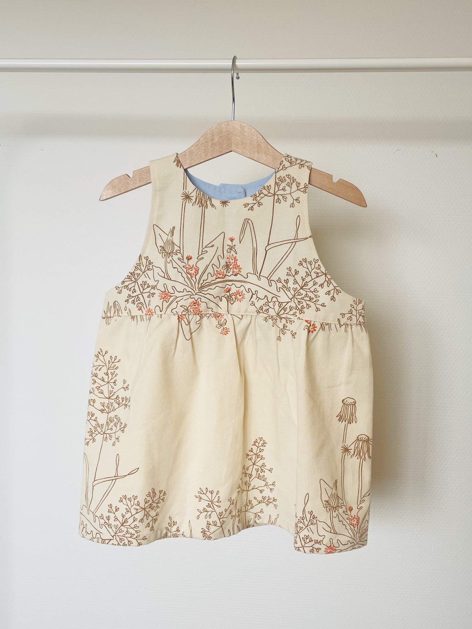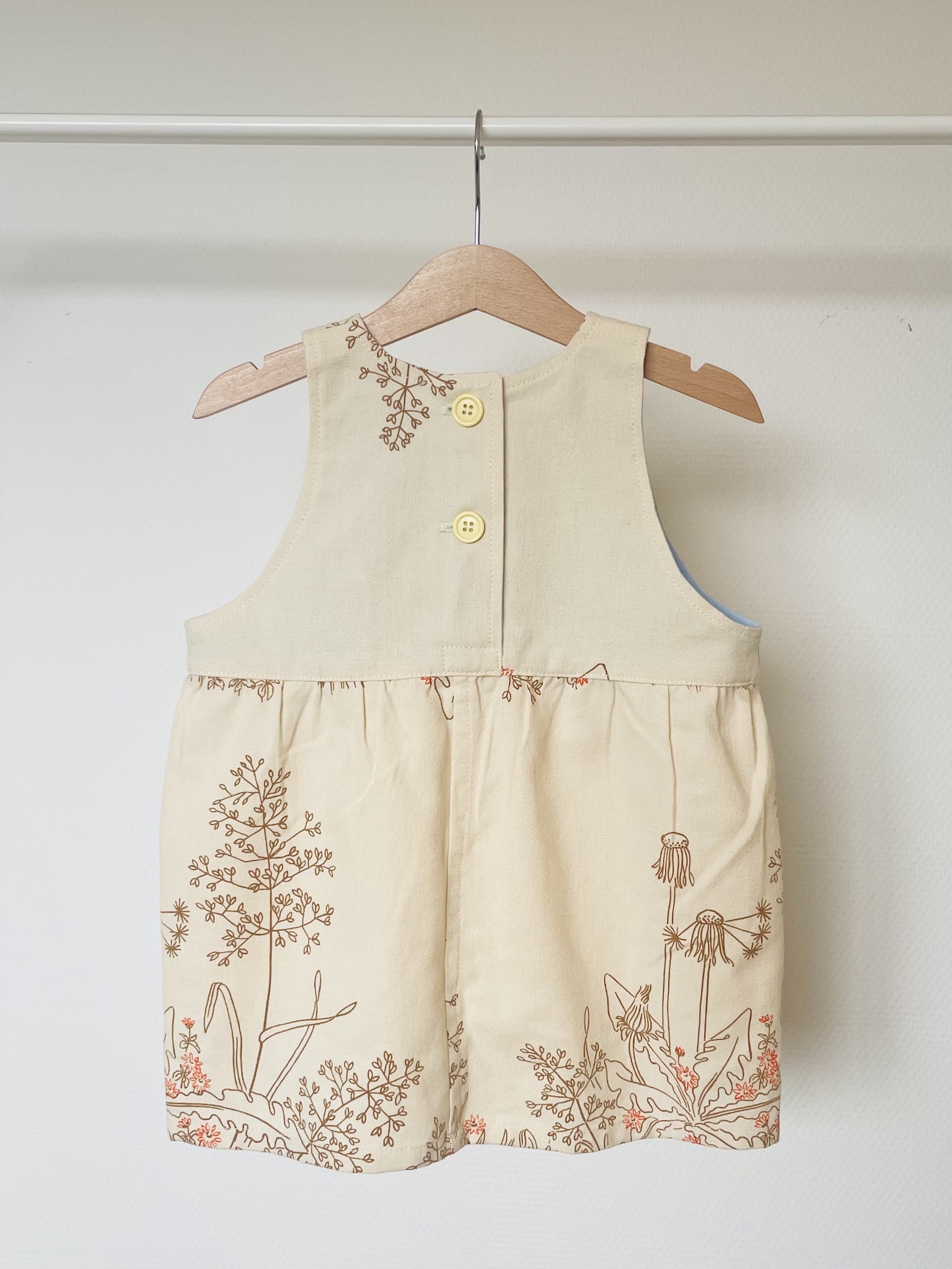Cremefarvede kjole, med brunt print af mælkebøtter og andre planter. Der er også små forårsblomster i lys orange og jeg har syet gule knapper i.